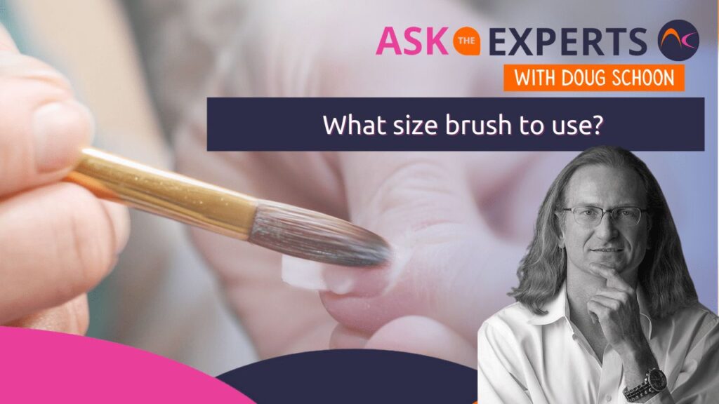 With any nail product, I recommend a #8 size or smaller brush. Some can use a #10 brush without overexposing the skin but greater care and attention are needed to prevent using too much monomer. I don’t recommend brushes larger than a #10. In my view, that’s trouble waiting to happen.