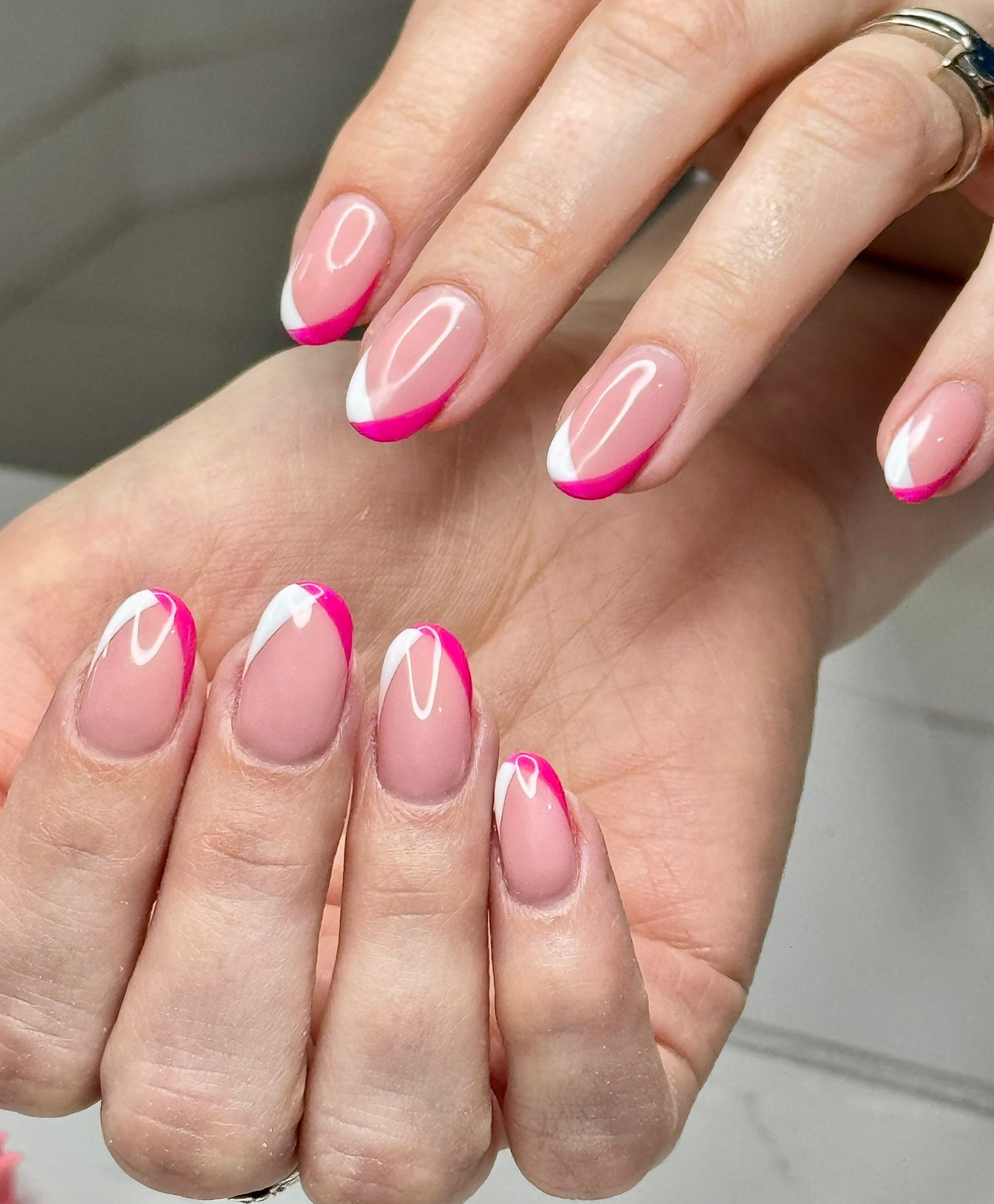 Construtor de gelEstilizada em nail art 3D representando Curls & Swirls. Essas unhas de formato médio e oval foram criadas usando o sistema Builder e são coloridas com Multi.
